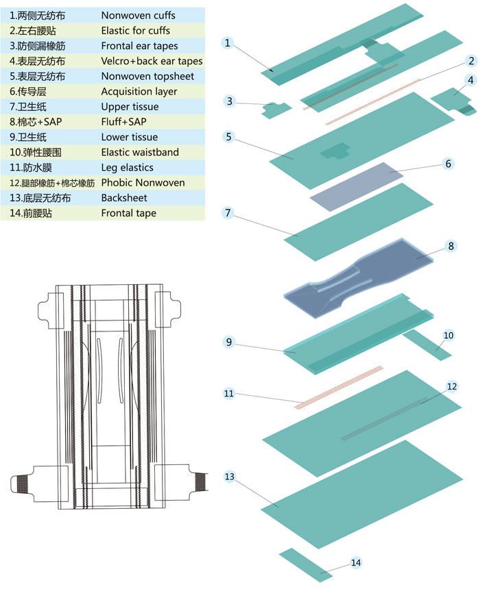 Speed range500 - 800 PPMSAP applicator is divided into two regions feeding, which can be realized by adding two different SAP.3D Top-sheet embossing system, can make the product surface material in 3D effect.Product detection system (including the weight, metal, appearance, position).